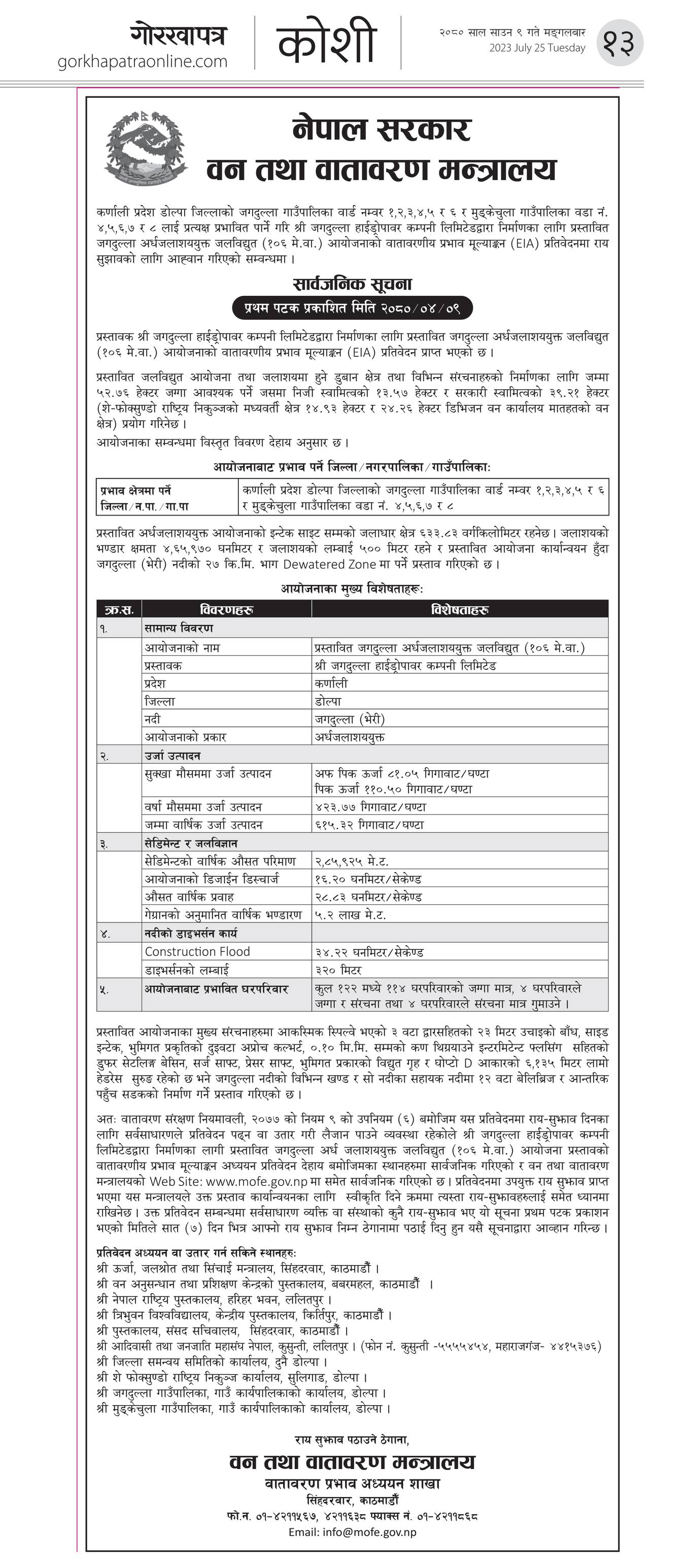 - वन तथा वातावरण मन्त्रालयमा स्वीकृतिका लागि पेश गरिएको जगदुल्ला अर्धजलाशययुक्त जलविद्युत आयोजना (१०६ मे.वा.)” को “वातावरणीय प्रभाव मूल्यांकन प्रतिवेदन” माथि सर्वसाधारण व्यक्ति वा संस्थाको राय सुझाव संकलन गर्न ७ दिने सूचना