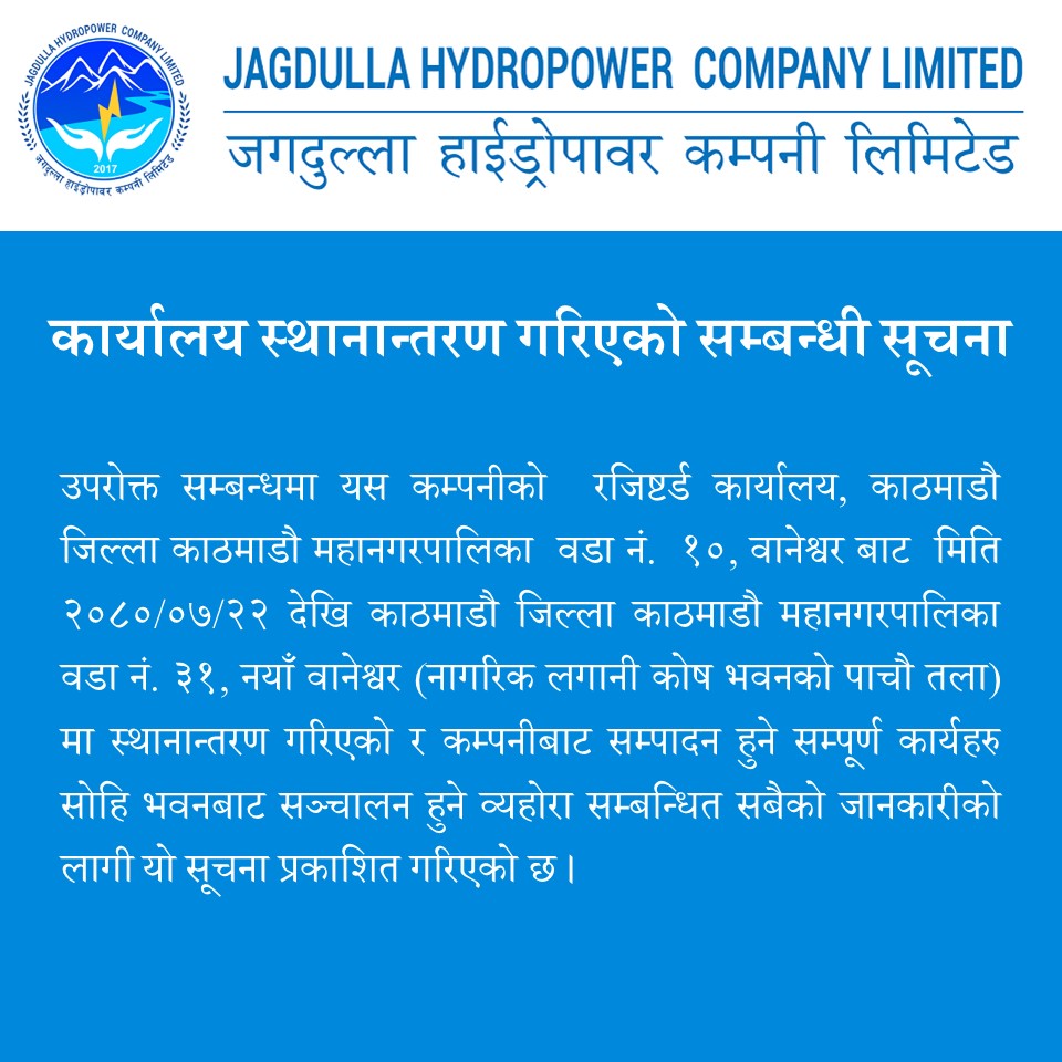 - जगदुल्ला अर्धजलाशययुक्त जलविद्युत आयोजना सम्बन्धी सार्वजनिक सूचना