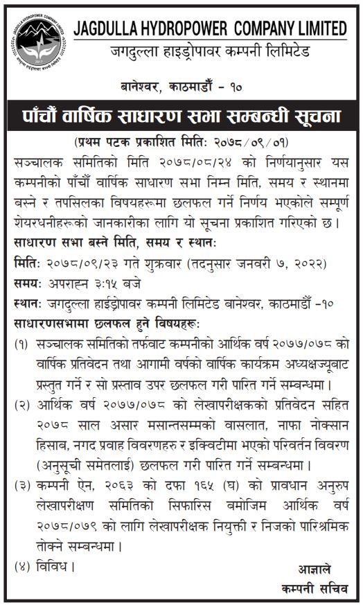 - जगदुल्ला हाईड्रोपावर कम्पनी लिमिटेडको आर्थिक बर्ष २०७८/०७९ को बार्षिक लेखा प्रतिवेदन