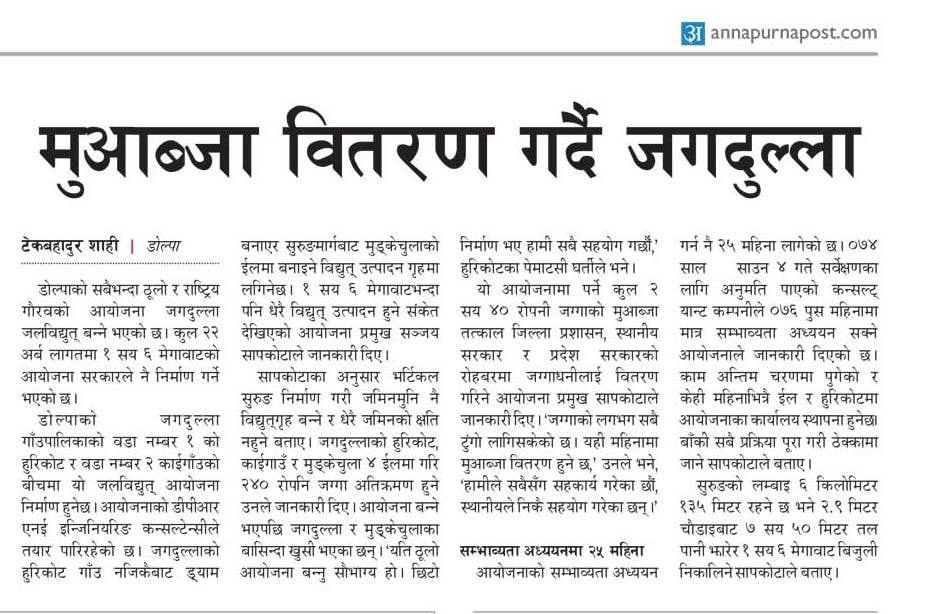 - जगदुल्ला जलविद्युत् आयोजनाको मुआब्जा वितरण कार्य शुरु