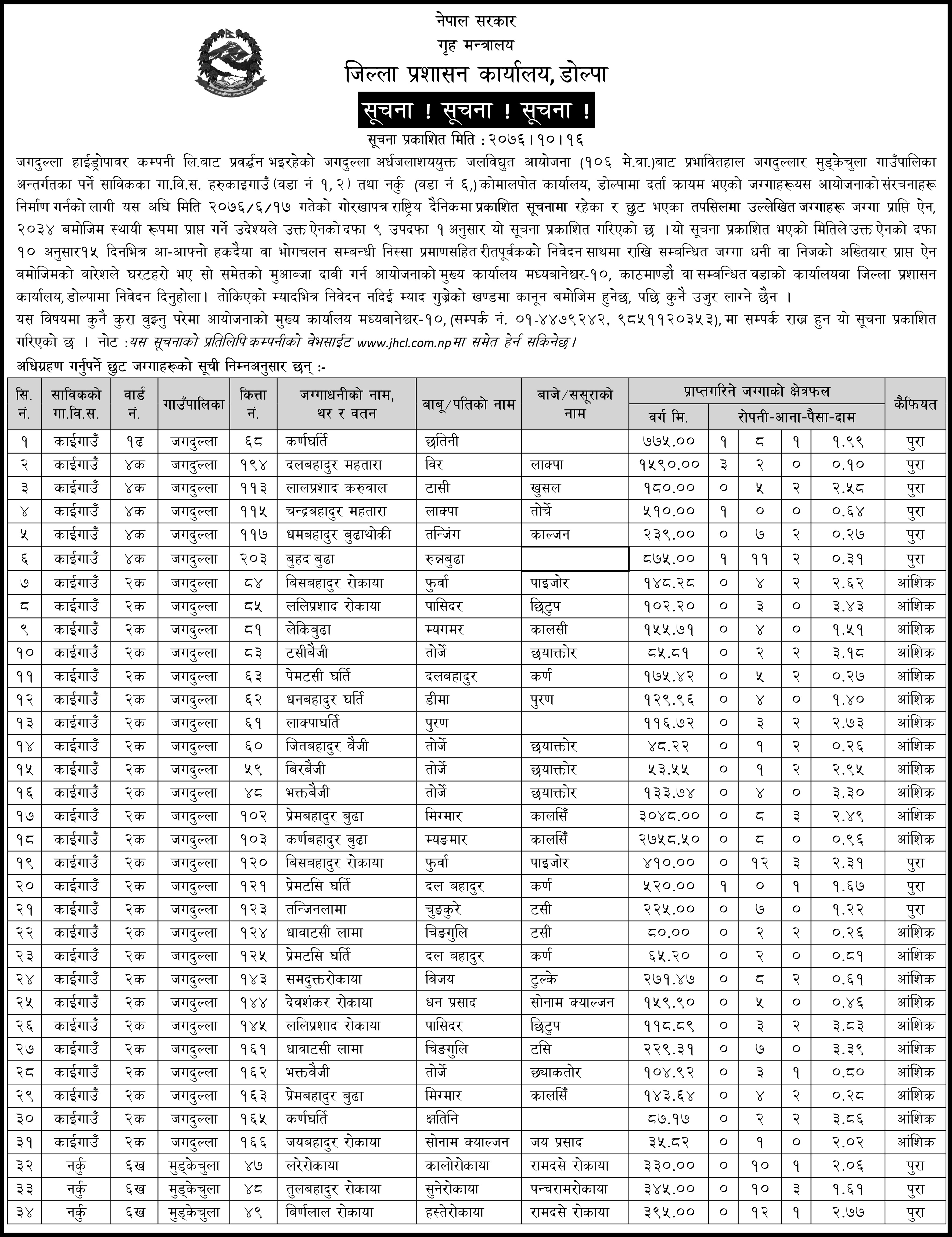 - जग्गा अधिग्रहण सम्बन्धि मिति २०७६।१०।१६ को सूचना ।