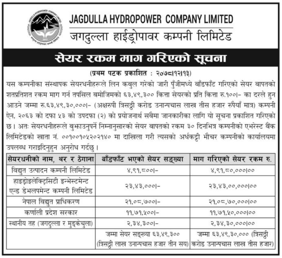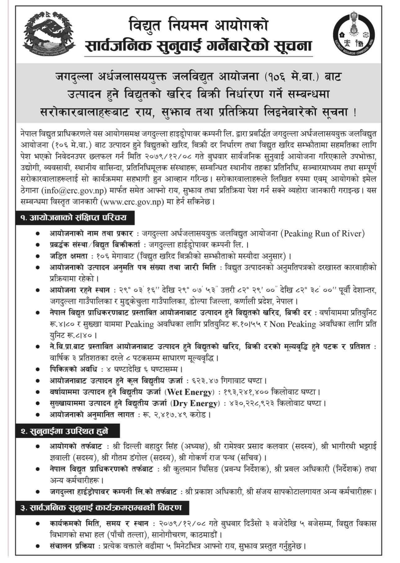 - जगदुल्ला अर्धजलाशययुक्त जलविद्युत आयोजना (१०६ मे. वा.) बाट उत्पादन हुने विद्युतको खरिद बिक्री निर्धारण गर्ने सम्बन्धमा सरोकारवालाहरुबाट राय, सुझाव तथा प्रतिक्रिया लिइनेबारे सूचना !