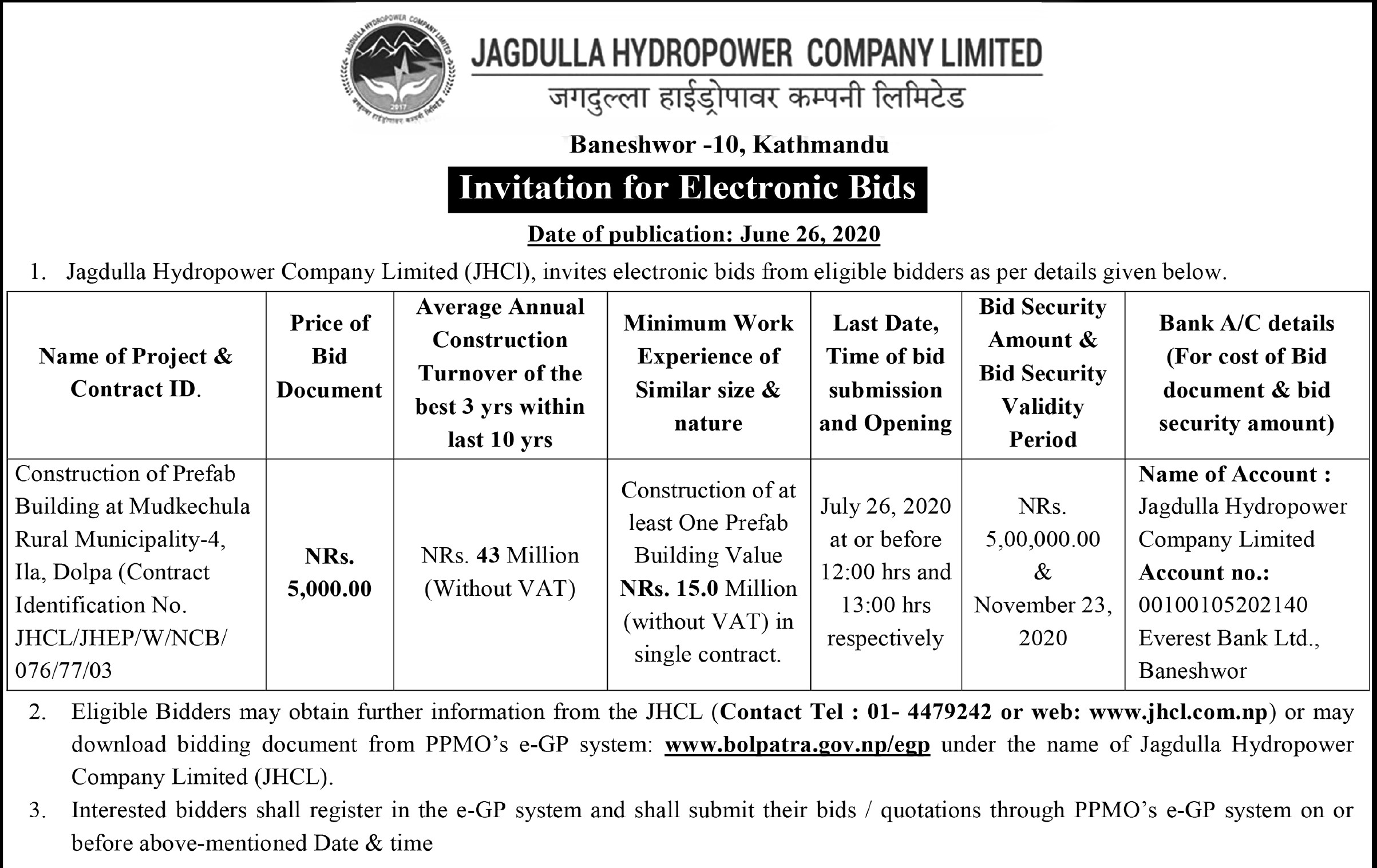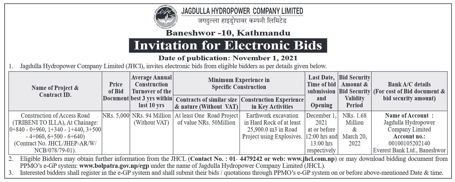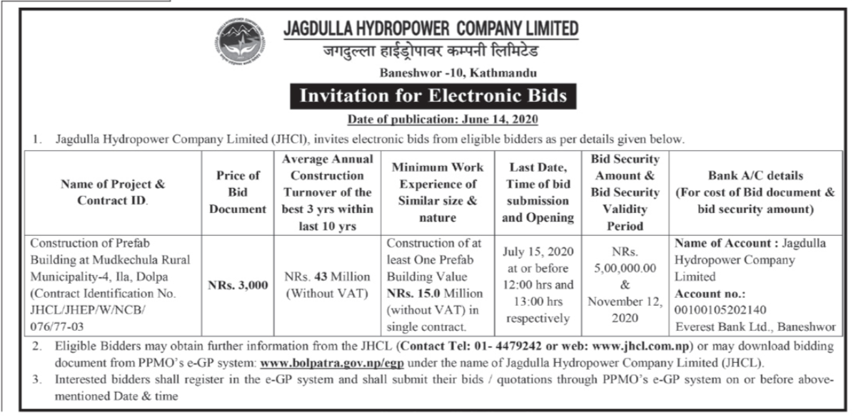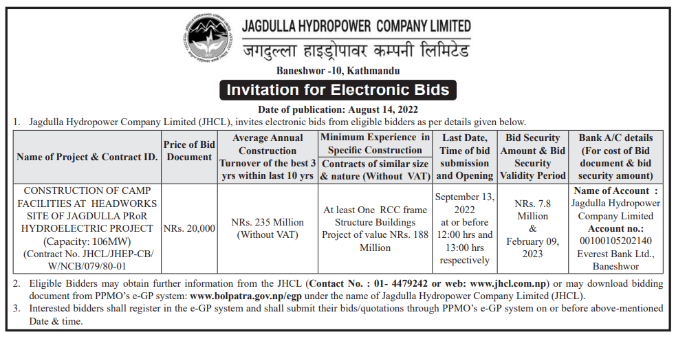 - Invitation for Electronic Bids - Construction of Camp Facilities At Headworks Site Of Jagdulla PRoR Hydroelectric Project