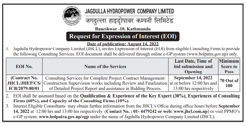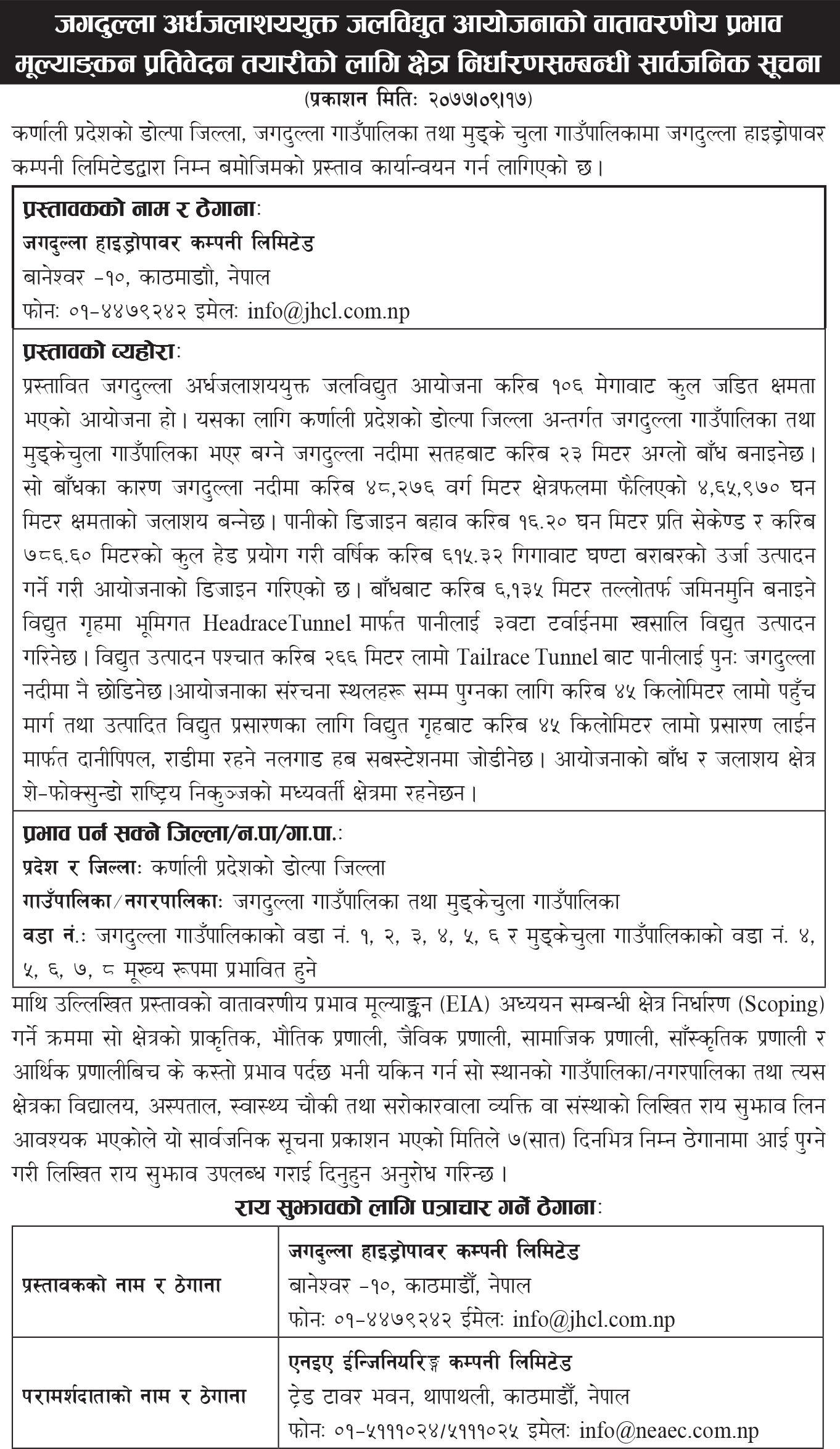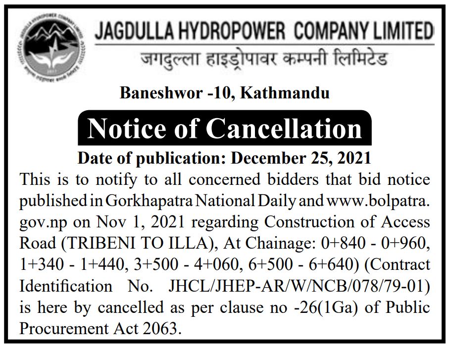 - जगदुल्ला अर्धजलाशययुक्त जलविद्युत आयोजना (१०६ मेगावाट) को वातावरणीय अध्ययन प्रतिवेदन तयारी सम्बन्धी सार्वजनिक सूचना (वातावरण संरक्षण नियमावली, २०७७ को नियम ७ को उपनियम (३) सँग सम्बन्धित)