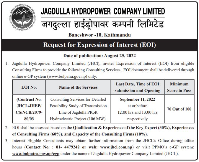 - Request For Expression Of Interest (EOI) - Consulting Services for Detailed Feasibility Study of Transmission Line of Jagdulla PRoR Hydroelectric Project (106 MW)